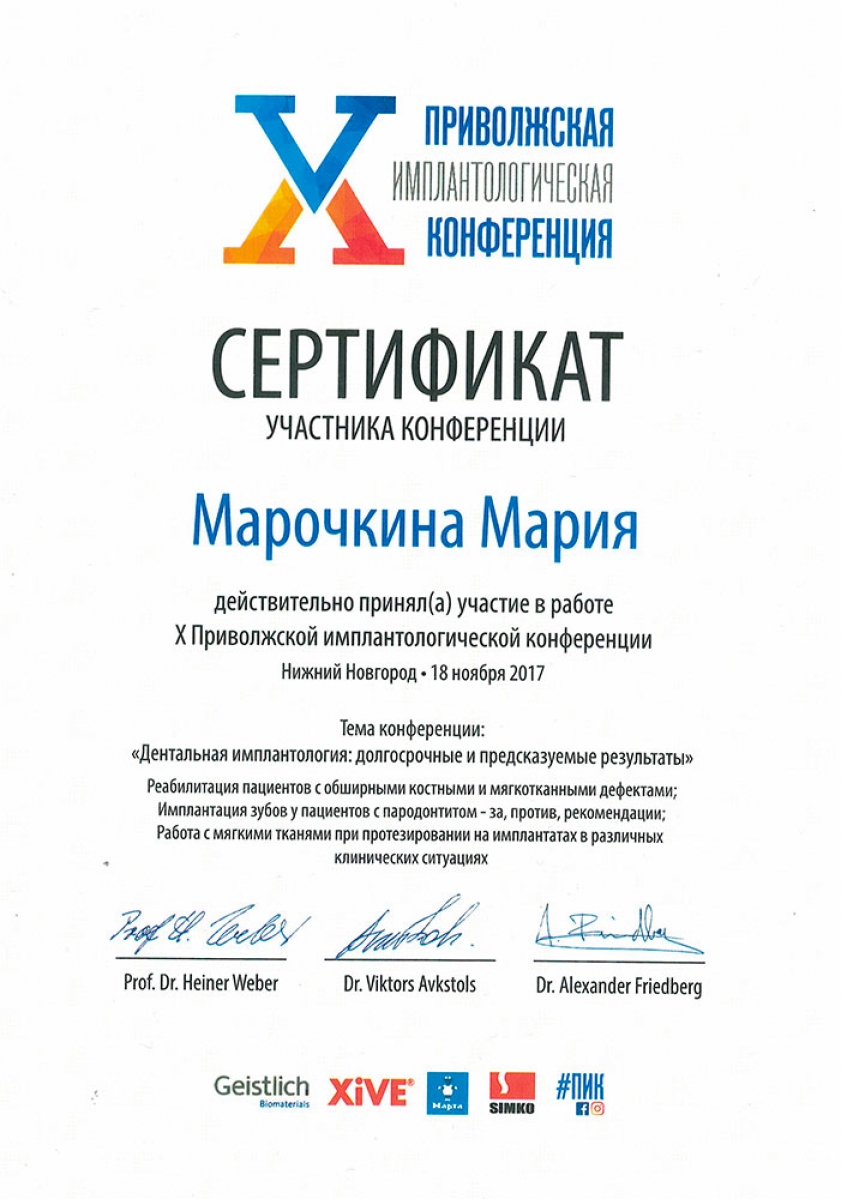 В 2009 году закончила с отличием стоматологический факультет Нижегородской государственной медицинской академии (диплом ВСА № 0581928). 2009-2011 – клиническая ординатура по специальности «Стоматология хирургическая». В 2014 году защитила кандидатскую диссертацию под руководством проф. Дурново Е.А. (диплом ДКН № 205241). С 2011 по 2018 год являлась ассистентом кафедры хирургической стоматологии НижГМА, принимая участие в обучении студентов и научной жизни НижГМА. С самого начала практической деятельности М.С.Марочкина вела обширный клинический прием пациентов, в т.ч. со сложной патологией челюстно-лицевой области. Имеет 17 научных печатных работ и является автором 3 патентов РФ на изобретение. |