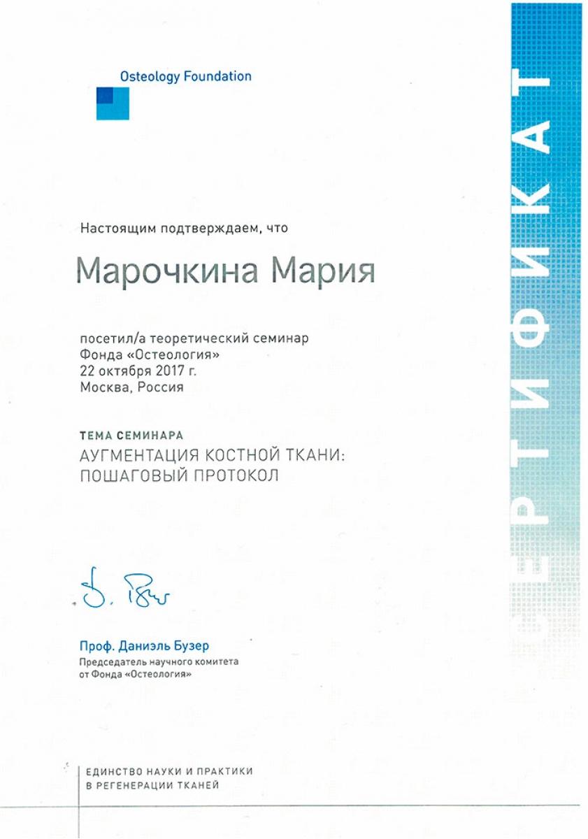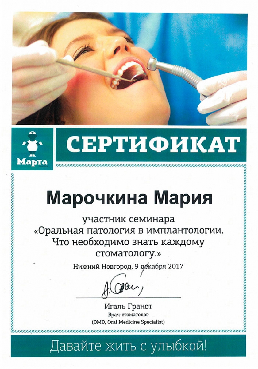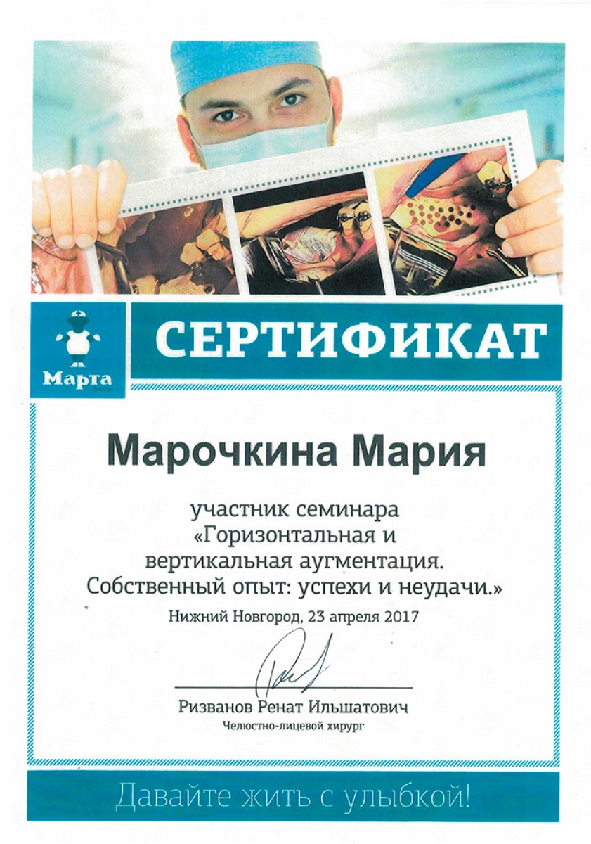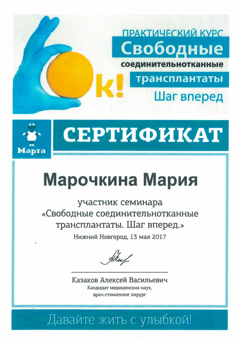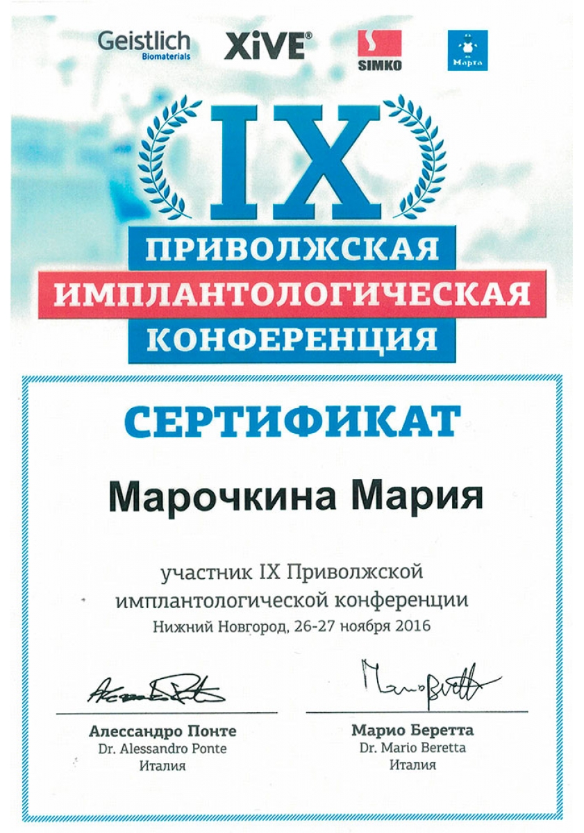 В 2009 году закончила с отличием стоматологический факультет Нижегородской государственной медицинской академии (диплом ВСА № 0581928). 2009-2011 – клиническая ординатура по специальности «Стоматология хирургическая». В 2014 году защитила кандидатскую диссертацию под руководством проф. Дурново Е.А. (диплом ДКН № 205241). С 2011 по 2018 год являлась ассистентом кафедры хирургической стоматологии НижГМА, принимая участие в обучении студентов и научной жизни НижГМА. С самого начала практической деятельности М.С.Марочкина вела обширный клинический прием пациентов, в т.ч. со сложной патологией челюстно-лицевой области. Имеет 17 научных печатных работ и является автором 3 патентов РФ на изобретение. |