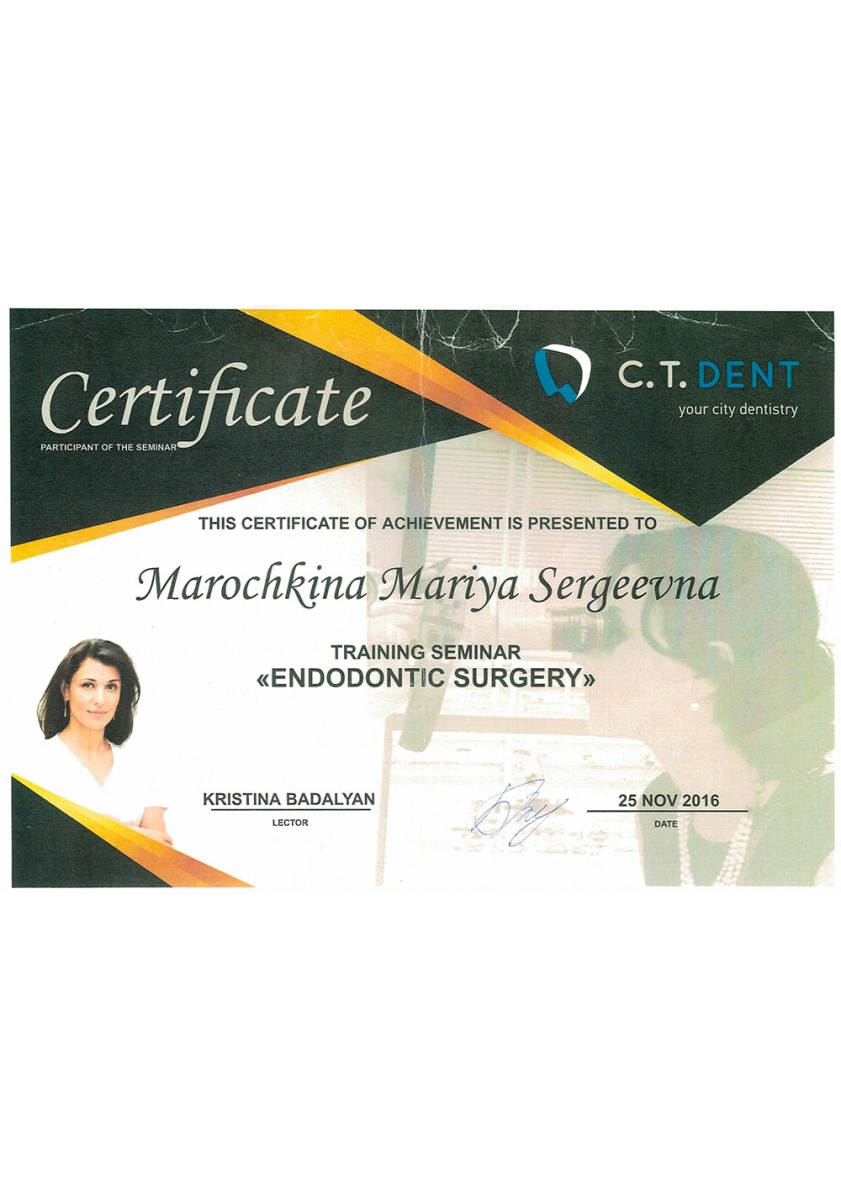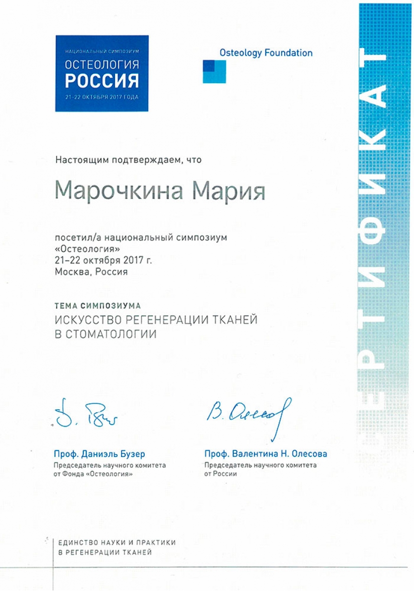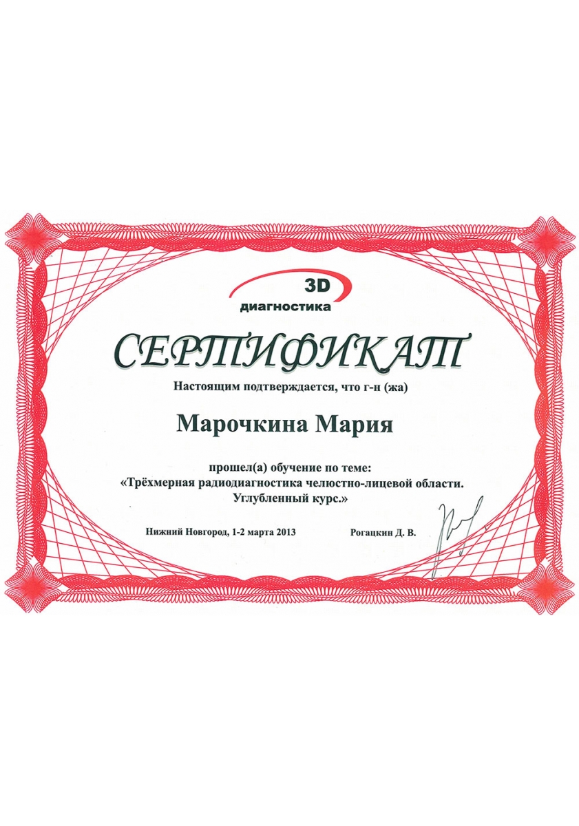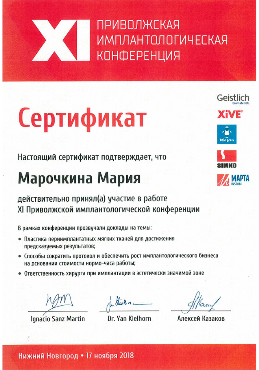 В 2009 году закончила с отличием стоматологический факультет Нижегородской государственной медицинской академии (диплом ВСА № 0581928). 2009-2011 – клиническая ординатура по специальности «Стоматология хирургическая». В 2014 году защитила кандидатскую диссертацию под руководством проф. Дурново Е.А. (диплом ДКН № 205241). С 2011 по 2018 год являлась ассистентом кафедры хирургической стоматологии НижГМА, принимая участие в обучении студентов и научной жизни НижГМА. С самого начала практической деятельности М.С.Марочкина вела обширный клинический прием пациентов, в т.ч. со сложной патологией челюстно-лицевой области. Имеет 17 научных печатных работ и является автором 3 патентов РФ на изобретение. |