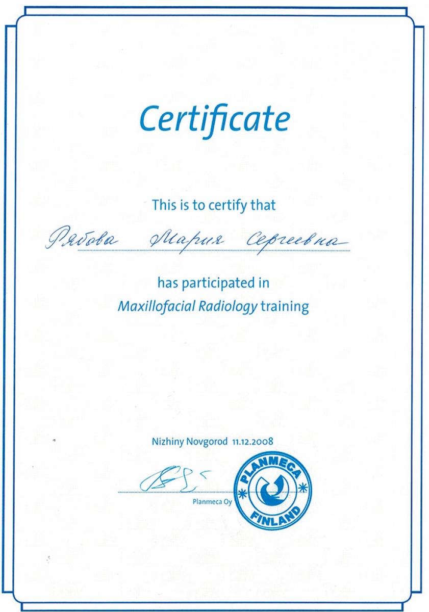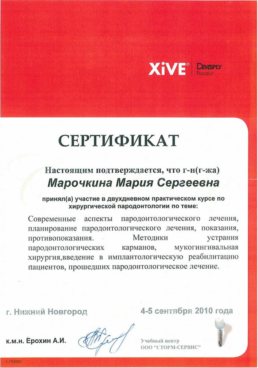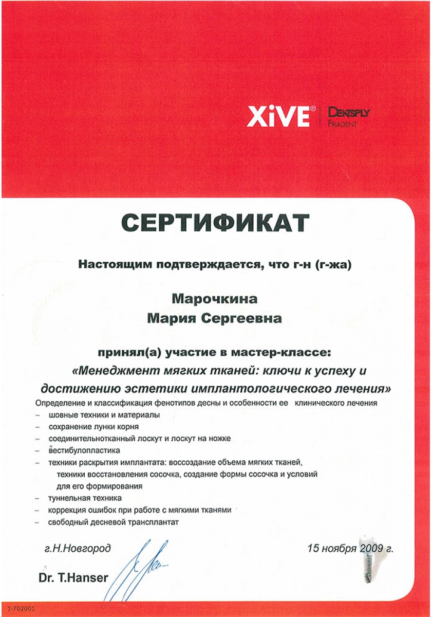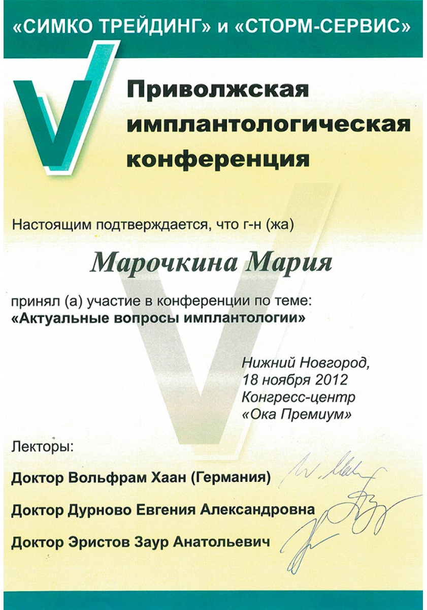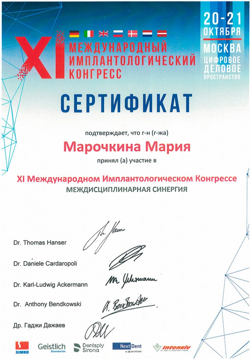 В 2009 году закончила с отличием стоматологический факультет Нижегородской государственной медицинской академии (диплом ВСА № 0581928). 2009-2011 – клиническая ординатура по специальности «Стоматология хирургическая». В 2014 году защитила кандидатскую диссертацию под руководством проф. Дурново Е.А. (диплом ДКН № 205241). С 2011 по 2018 год являлась ассистентом кафедры хирургической стоматологии НижГМА, принимая участие в обучении студентов и научной жизни НижГМА. С самого начала практической деятельности М.С.Марочкина вела обширный клинический прием пациентов, в т.ч. со сложной патологией челюстно-лицевой области. Имеет 17 научных печатных работ и является автором 3 патентов РФ на изобретение. |